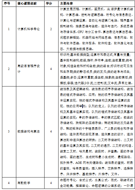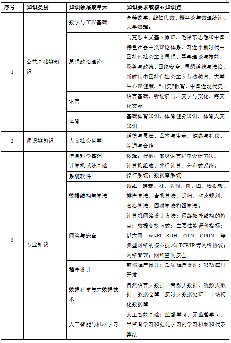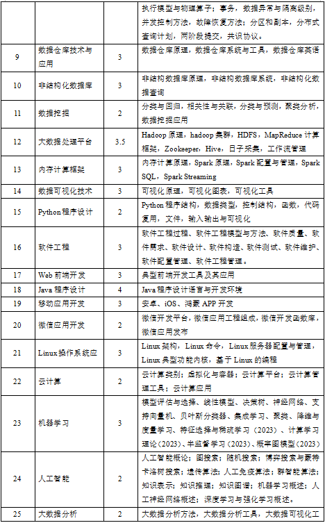 (3)专业知识:具有数据科学与大数据技术的数学基础、信息科学基础知识,了解学科的知识结构、典型技术、核心概念和基本工作流程。具有计算机体系结构、计算理论、数据科学与大数据技术、数据库系统、人工智能、信息安全等领域的专业知识,并在某一方面有所侧重。