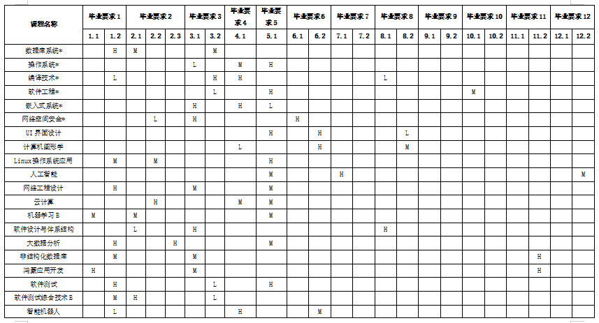 本专业课程及实践教学环节对毕业要求的支撑度(H、M、L)如下: