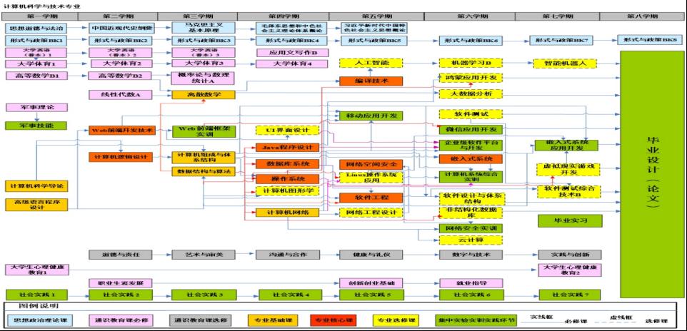 专业核心课程:高级语言程序设计、数据结构与算法、计算机网络、计算机组成与体系结构、计算机逻辑设计、Java程序设计、Web前端开发技术、数据库系统、操作系统、编译技术、软件工程、嵌入式系统、网络空间安全等。