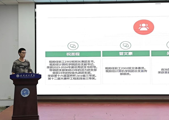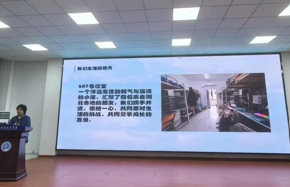 第一位登场的是 1 栋 - 607 寝室的代表。他以幽默风趣的语言,生动地向大家介绍了寝室的日常生活与行为习惯,让在场观众仿佛身临其境,真切感受到了该寝室轻松愉快的氛围。这个由四位来自湖北各地的朋友组成的小家庭,始终携手并进、团结一心,共同迎接生活的挑战,分享成长的喜悦,展现出了深厚的室友情谊。