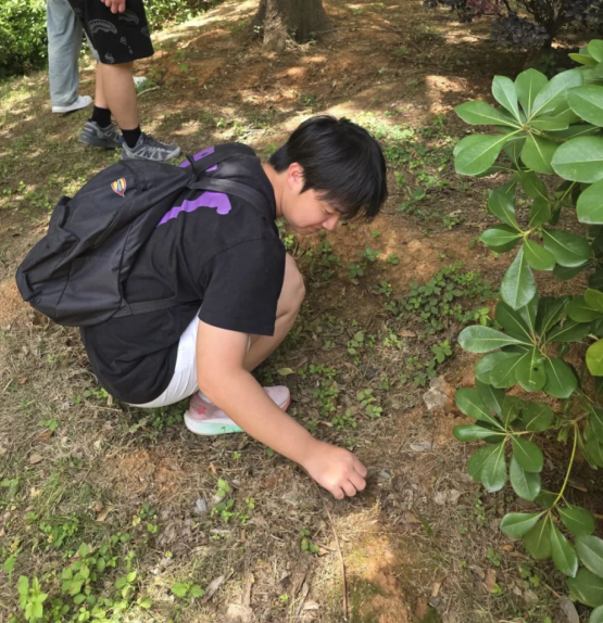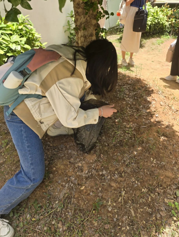 烈日下,同学们的身影穿梭在绿植与步道之间。有人用树枝拨开密集的草丛,找出藏匿的石块;有人半跪在地上,耐心抠出卡在缝隙中的碎石。过程中,大家互相提醒、默契配合,不时分享“寻石”小技巧,笑声随着一块块石头被清理而此起彼伏,劳动氛围轻松热烈。