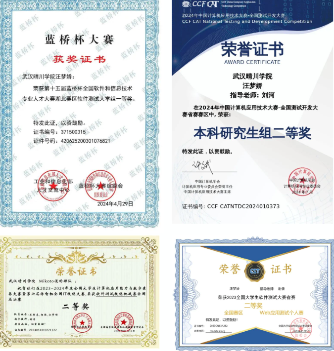 经历:曾荣获蓝桥杯全国软件和信息技术专业人才大赛湖北赛区软件测试大学组一等奖、获全国高校计算机能力挑战赛Python湖北赛区本研组二等奖、全国高校计算机能力与数字素养全国赛区本研组二等奖等奖、教师资格证等。
