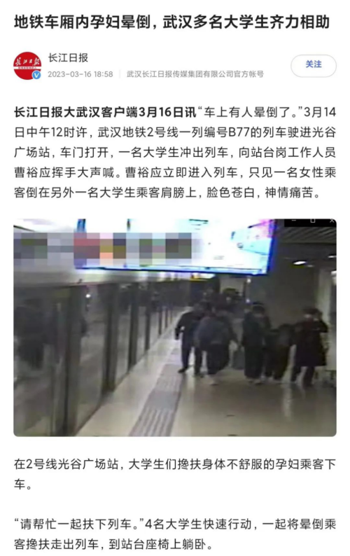 武汉晴川学院4名同学救助孕妇的这温暖一幕发生后,地铁二号线运营部专门打来电话向学校表示感谢。湖北发布、武汉交通广播、极目新闻、长江日报新闻客户端等多家新闻媒体纷纷进行了报道,为4名大学生点赞。