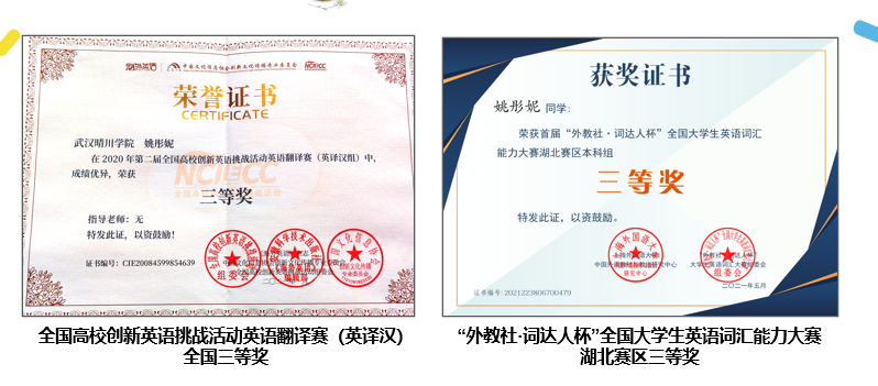 在A类学科竞赛中,在全国大学生计算机应用能力与信息素养大赛总决赛中荣获全国三等奖,新华三杯全国大学生数字技术大赛荣获湖北赛区二等奖,全国高校创新英语挑战活动英语翻译赛(英译汉)中荣获全国三等奖,“外教社·词达人杯”全国大学生英语词汇能力大赛中荣获湖北赛区三等奖,此外在全国计算机能力挑战赛的各赛道中分别取得了全国一等,华中一等,华中二等的好成绩。也曾以优秀的成绩,突出的表现连续两年获得奖学金,也被授予三好学生的荣誉称号。在其他各领域获得荣誉证书25余项
