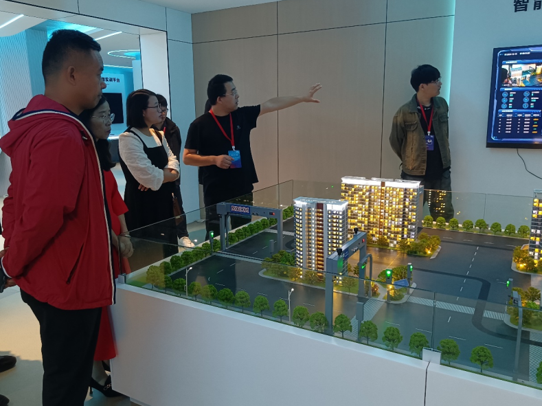 会前学院一行人在梅牧文的带领下参观了数字人才实训基地,该基地目前有一个展览厅,21个实训教室,大量尖端数字实训设备,围绕技能培训、实训、竞赛、就业、创新创业等功能,覆盖鸿蒙、云计算、大数据、人工智能等多个培养方向。在展厅,学院领导考察了智能数字教学平台、智慧城市沙盘案例,希望双方以校企合作为契机,进一步加强联系,为计算机产业发展贡献力量。