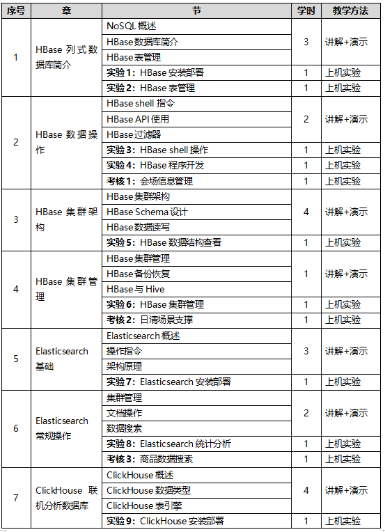 本课程是本专业的核心课程之一,主要培养学生对大数据数据管理系统的理解,多种数据管理系统的使用与相互结合的能力。内容包括:HBase列式数据库简介;HBase数据库架构;HBase集群管理;Elasticsearch基础;Elasticsearch常规操作;ClickHouse联机分析数据库;ClickHouse数据定义与操作;ClickHouse管理与监控。