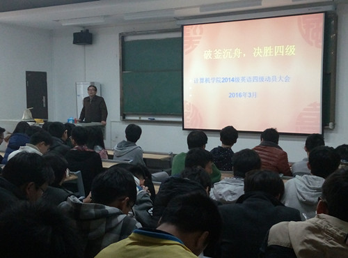 (本网讯)为了更好的迎接6月份即将到来的全国大学生英语四级考试,3月23日伟德体育在教学楼1-312召开了“破釜沉舟,决胜四级”的四级动员大会,本次大会主要是针对大二学生两个月后的大学英语四级考试。大会14:30准时开始, 14计科、14软工、14物联网的同学们积极参与。
