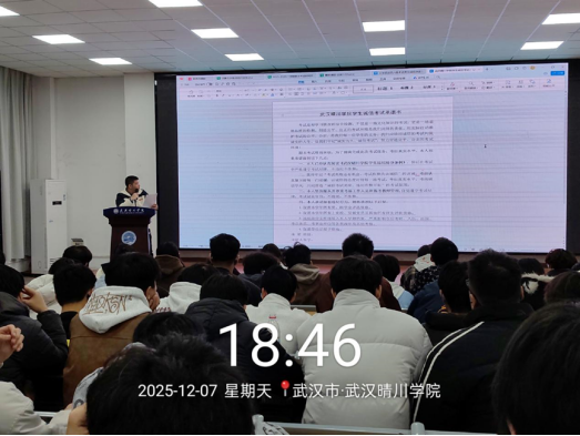 24级辅导员杜泽老师在综2-105报告厅开展期末诚信教育工作。他结合《武汉晴川学院学生诚信考试承诺书》内容进行具体讲解,他强调,作弊直接取消学位证,同时取消本学年奖助学金、评优评先、入党等资格,处分记入档案。